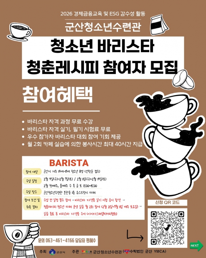 ¾È³çÇϼ¼¿ä. ±º»êû¼Ò³â¼ö·Ã°ü¿¡¼ û¼Ò³â ¹Ù¸®½ºÅ¸ ÀڰݰúÁ¤ ¡®Ã»Ãá·¹½ÃÇÇ¡¯ Âü¿©ÀÚ¸¦ ¸ðÁýÇÕ´Ï´Ù. º» ÇÁ·Î±×·¥Àº ¹Ù¸®½ºÅ¸ ±³À°°ú ÀÚ°Ý Ãëµæ °úÁ¤À» ÅëÇØ û¼Ò³âÀÇ Á÷¾÷ ÀÌÇØ¸¦ ³ôÀ̰í, ¼ö·Ã°ü 1Ãþ À¯½ººê¸´Áö Ä«Æä¿¡¼ ½ÇÁ¦ Ä«Æä ¿î¿µ ½Ç½À¿¡ Âü¿©Çϴ û¼Ò³â ´ë»ó °æÁ¦¡¤±ÝÀ¶ ¹× ESG °¨¼ö¼º Ȱµ¿ ÇÁ·Î±×·¥ÀÔ´Ï´Ù.