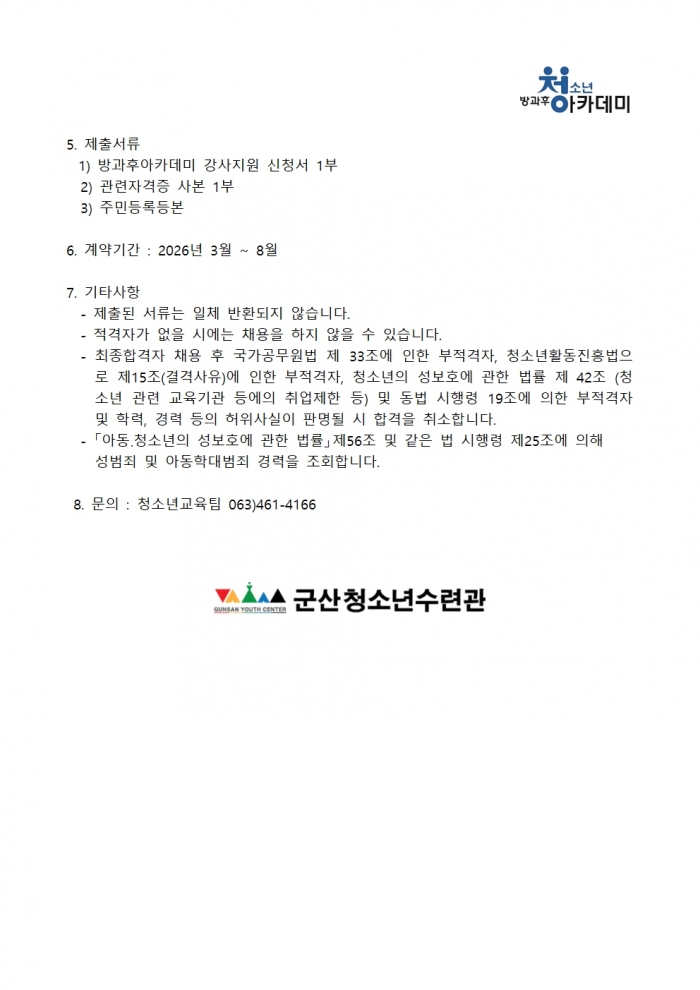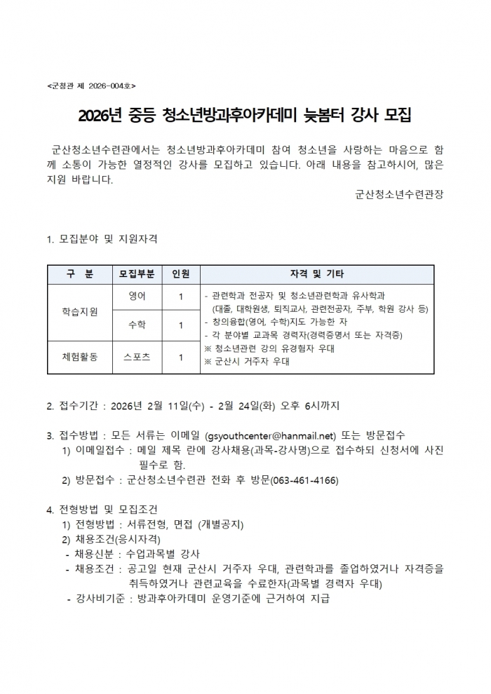 ±ÛÁ¦¸ñ: <±ºÃ»°ü Á¦2026-004È£> 2026³â Áßµî û¼Ò³â¹æ°úÈľÆÄ«µ¥¹Ì ´Êº½ÅÍ °­»ç¸ðÁý