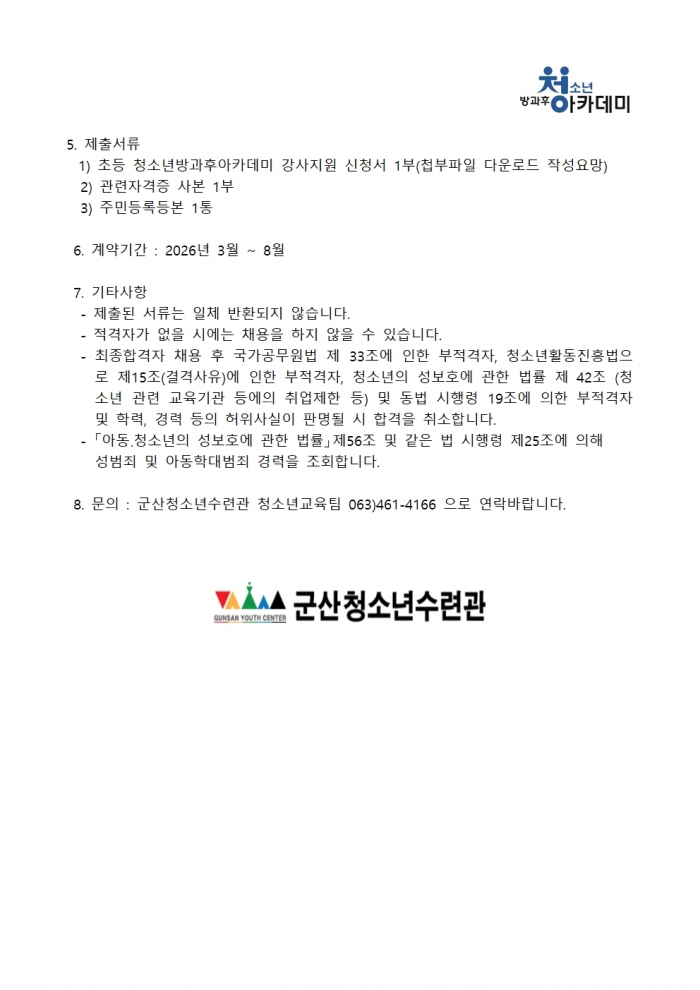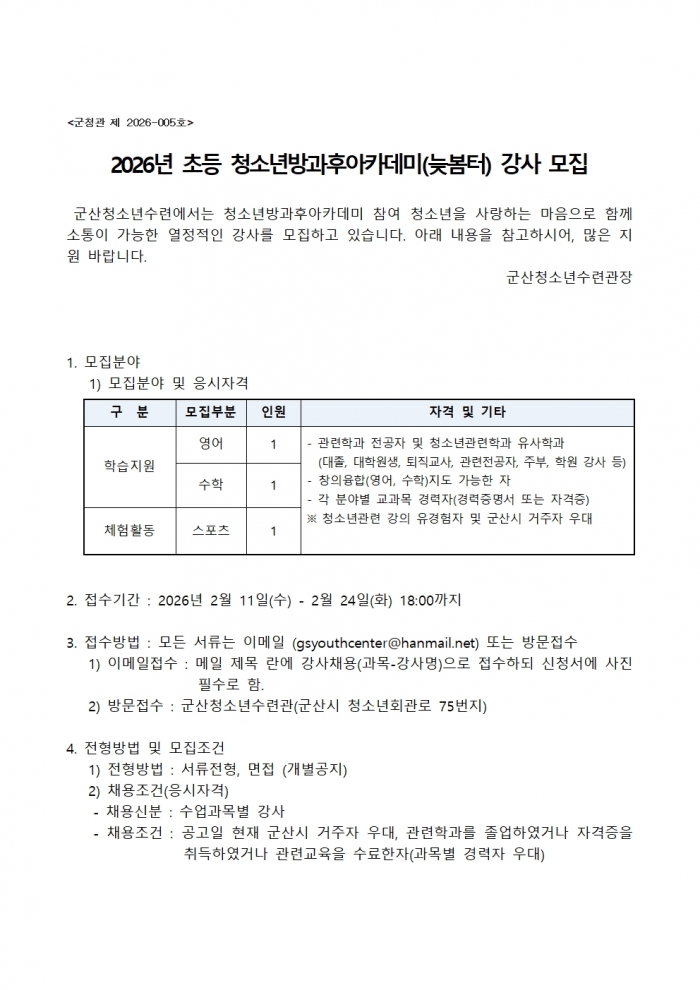 ±ÛÁ¦¸ñ: <±ºÃ»°ü Á¦2026-005È£> 2026³â Ãʵî û¼Ò³â¹æ°úÈľÆÄ«µ¥¹Ì ´Êº½ÅÍ °­»ç¸ðÁý