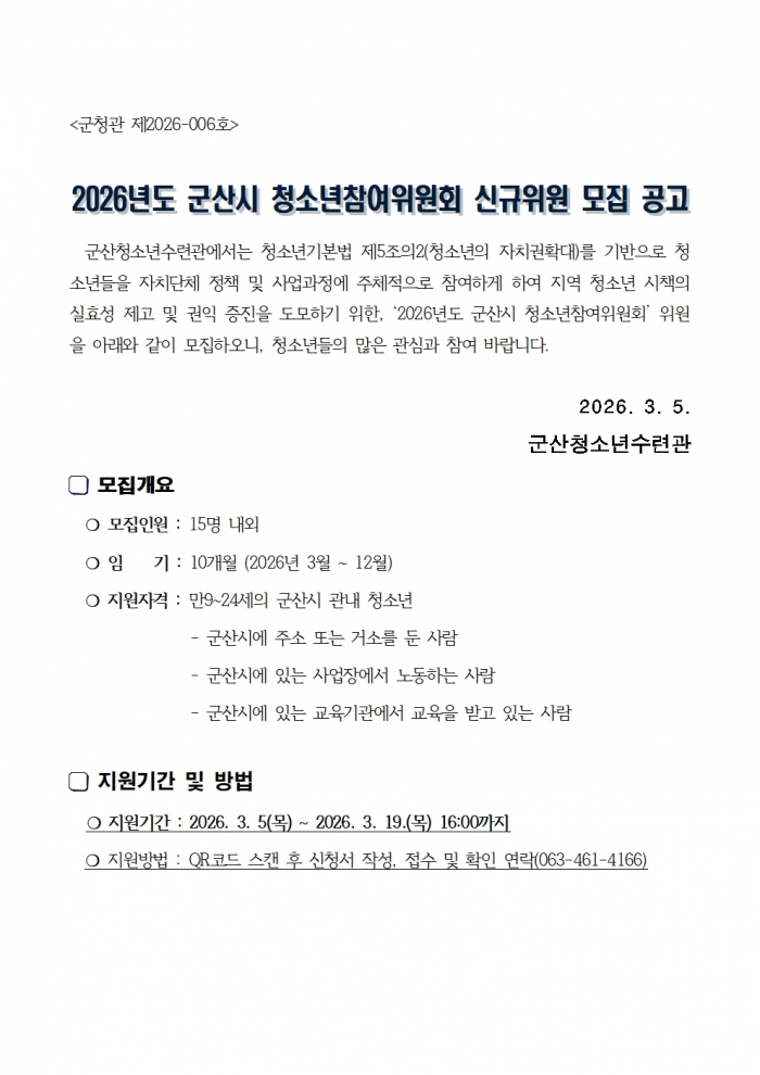 ±ÛÁ¦¸ñ: <±ºÃ»°ü Á¦2026-006È£> 2026 ±º»ê½Ã û¼Ò³âÂü¿©À§¿øÈ¸ À§¿ø ¸ðÁý ¾È³» ¹× Áö¿ø½Åû¼­