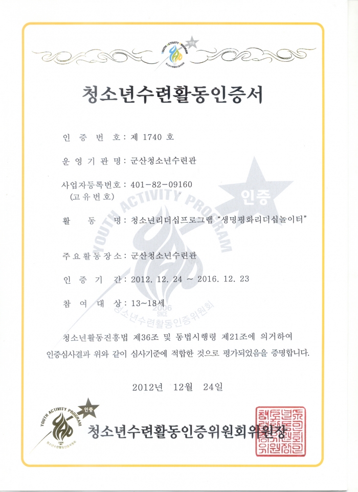±ÛÁ¦¸ñ: û¼Ò³â¼ö·ÃȰµ¿ÀÎÁõÇÁ·Î±×·¥ û¼Ò³â¸®´õ½ÊÇÁ·Î±×·¥ "»ý¸íÆòÈ­¸®´õ½Ê³îÀÌÅÍ" ÀÎÁõ ȹµæ