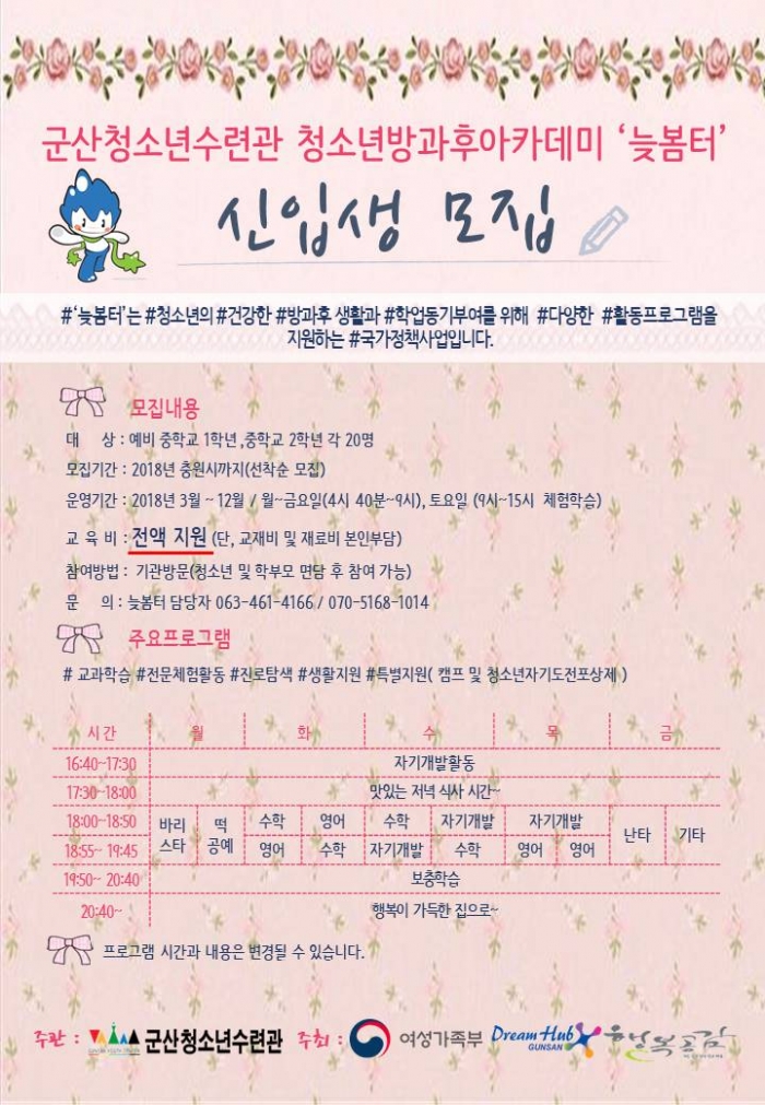µî, Çϱ³Â÷·®ÀÌ Áö¿øµÇ¸ç, Àú³á½Ä»ç°¡ Á¦°øµË´Ï´Ù.°ü½ÉÀִ û¼Ò³âµéÀº ´ã´çÀÚ¿Í ¸é´ãÀÌÈÄ Âü¿©°¡ °¡´ÉÇÕ´Ï´Ù.¼±Âø¼ø ¸ðÁýÀÌ¿À´Ï ¸¹Àº °ü½É°ú ½Åû ºÎʵ右´Ï´Ù!!^^