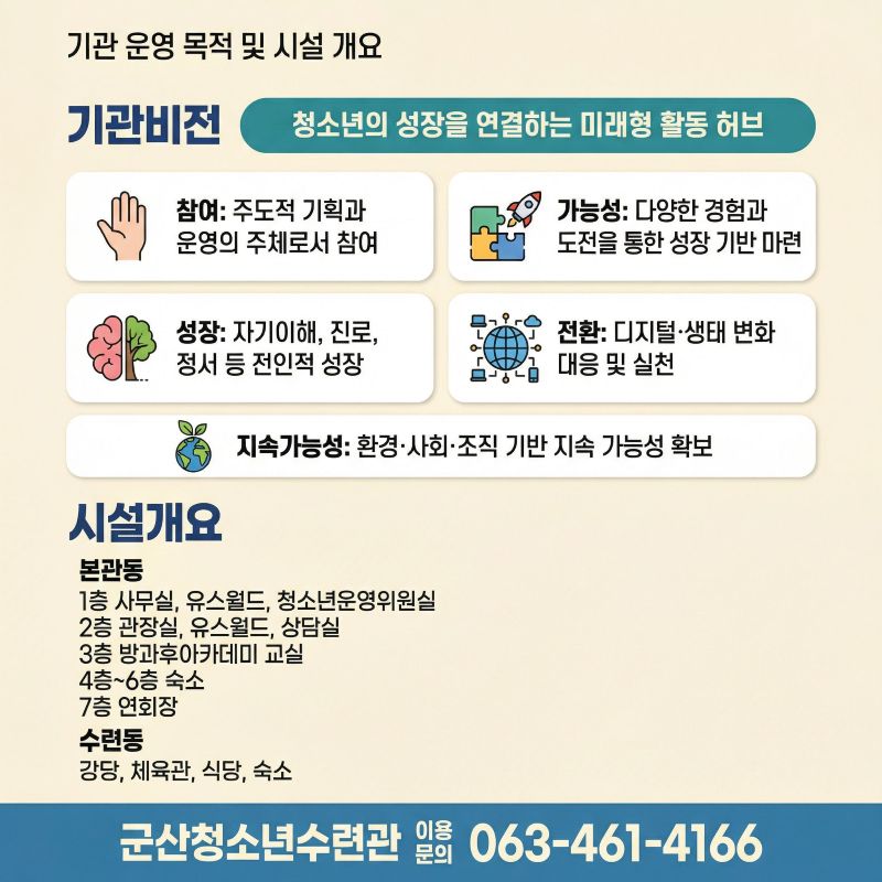 Home > ¼ö·Ã°ü ¼Ò°³ > ±â°ü¿î¿µ¸ñÀû ¹× ½Ã¼³°³¿ä