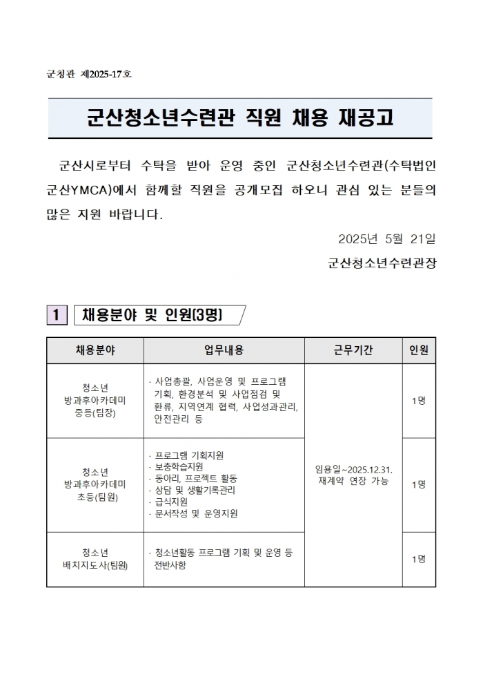 <°ø°í Á¦17È£> ±º»êû¼Ò³â¼ö·Ã°ü Á÷¿øÃ¤¿ë Àç°ø°í Á¶È¸: 1,242   ÀÛ¼ºÀÏ: 25-05-21