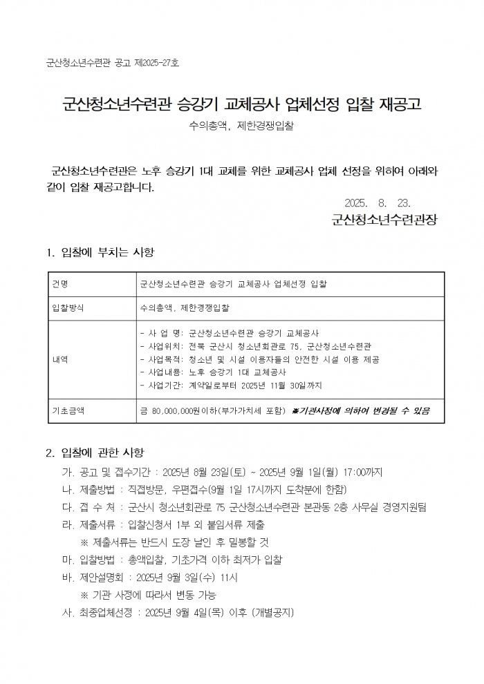 ±ÛÁ¦¸ñ: <°ø°íÁ¦27È£>±º»êû¼Ò³â¼ö·Ã°ü ½Â°­±â ±³Ã¼°ø»ç ¾÷ü¼±Á¤ ÀÔÂû Àç°ø°í